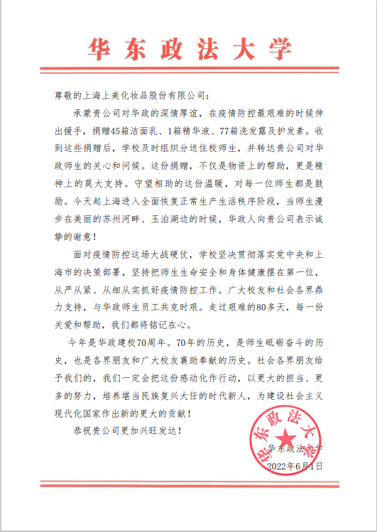 疫情校園封閉期間,校內(nèi)物資緊張,華東政法大學(xué)松江校區(qū)、長寧校區(qū)的在校師生們,出現(xiàn)護(hù)膚洗護(hù)用品短缺情況。收到學(xué)生們的求助后,上美集團(tuán)一葉子、極方品牌火速啟動捐贈事宜,調(diào)度123箱、共計零售價超50萬元的產(chǎn)品,馳援華東政法大學(xué),內(nèi)含洗面奶、洗發(fā)水等日常洗護(hù)必需品,約有13000名師生收到了抗疫物資,解決燃眉之急。