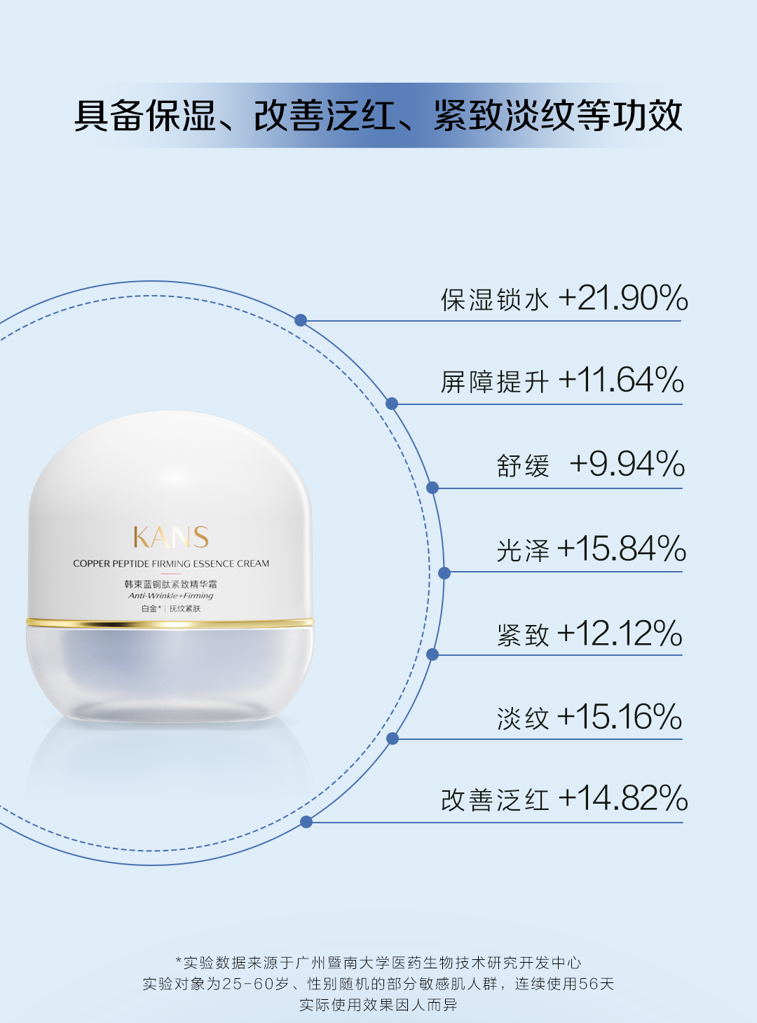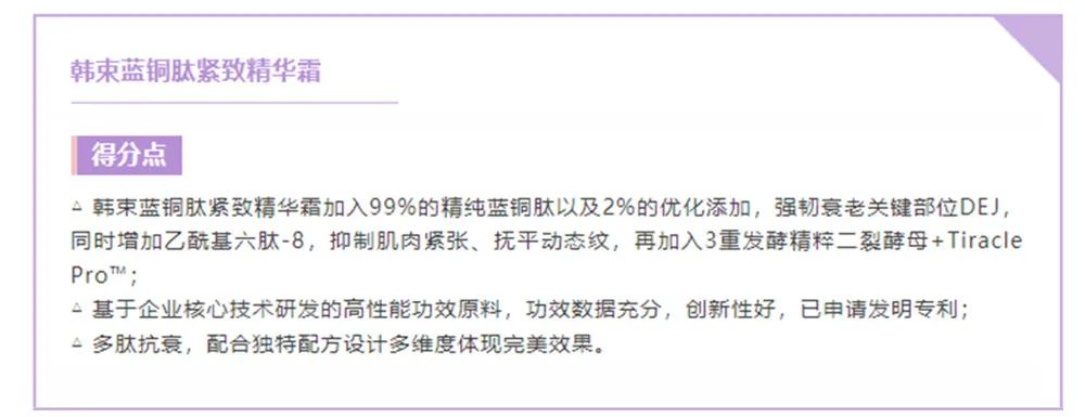 在配方運(yùn)用中,韓束科研團(tuán)隊(duì)將TIRACLE PRO復(fù)配純度高達(dá)99%的藍(lán)銅肽,與藍(lán)銅肽實(shí)現(xiàn)協(xié)同增效。從而更好發(fā)揮藍(lán)銅肽五大天然優(yōu)勢:減少炎性反應(yīng)及自由基損傷、抗衰緊致、保護(hù)和修護(hù)屏障、舒緩?fù)始t、安全低刺激。經(jīng)過多輪配方打磨,韓束藍(lán)銅肽白金緊致系列產(chǎn)品誕生。