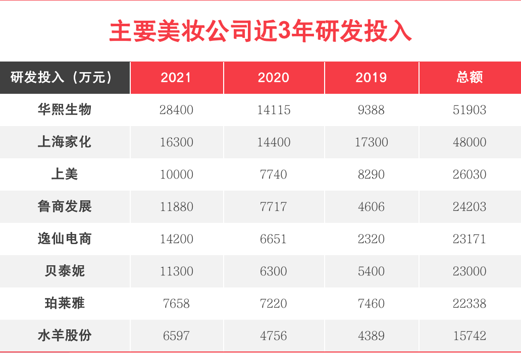 從對(duì)本土主要化妝品企業(yè)最近3年研發(fā)投入的統(tǒng)計(jì)可以看出,整體呈逐年增加的趨勢(shì),如果按照近3年的投資總額排名,除了從原料研發(fā)到品牌打造已經(jīng)形成一體化的華熙生物以及百年企業(yè)上海家化,上美近3年的研發(fā)投入總額,已經(jīng)排在了同類(lèi)型公司的最前列。