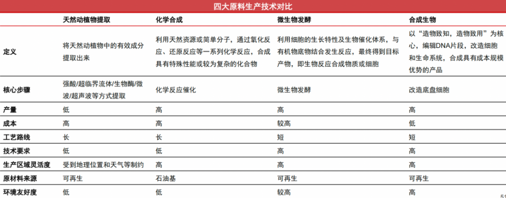 據(jù)了解,目前的化妝品原料核心來(lái)自“化學(xué)合成”“天然動(dòng)植物提取”“微生物發(fā)酵”和“合成生物”四大技術(shù)。其中“化學(xué)合成”技術(shù)是在化妝品領(lǐng)域應(yīng)用歷史最長(zhǎng),也是最為成熟的技術(shù)。而“天然植物萃取”和“微生物發(fā)酵”是目前最熱門(mén)的技術(shù)。“合成生物”則被認(rèn)為是能夠引領(lǐng)未來(lái)的新技術(shù)。[7]