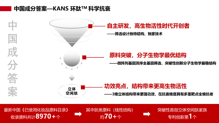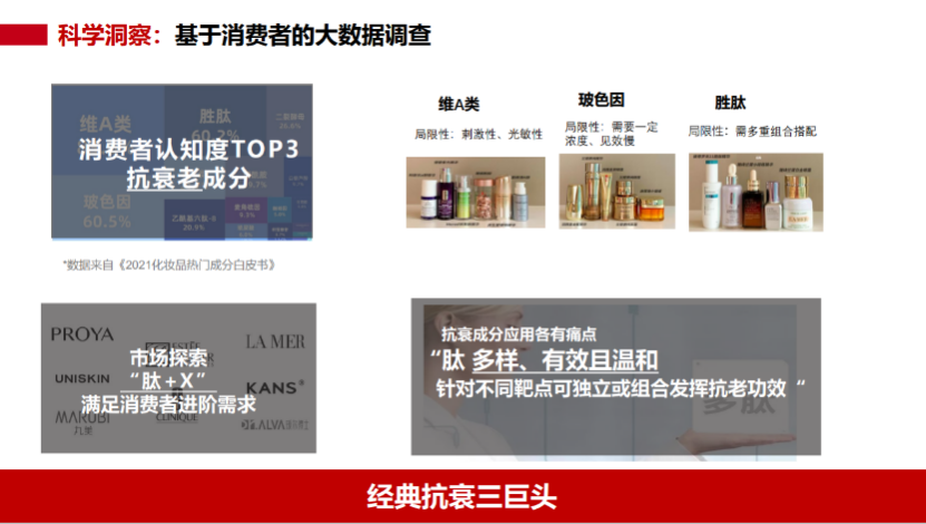 據(jù)負責人介紹,結合消費者數(shù)據(jù)調(diào)查,目前認知度TOP3的抗衰成分分別是維A類、玻色因、勝肽,但部分成分具有局限性,例如維A具有光敏性和刺激性;玻色因起效濃度要求高,起效周期很長。相比較而言,勝肽是目前來說比較全面的抗老「專家」,因此,定位科學抗衰的韓束將目光鎖定在肽類成分,開啟科研進階之路。
