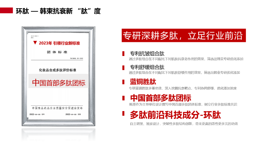 目前,韓束環(huán)肽已申請4項專利?;谇捌诩夹g研究的結果,韓束還將發(fā)布國內(nèi)首部《化妝品用料 合成多肽》團體標準,立足行業(yè)前沿,引領抗衰行業(yè)新發(fā)展。