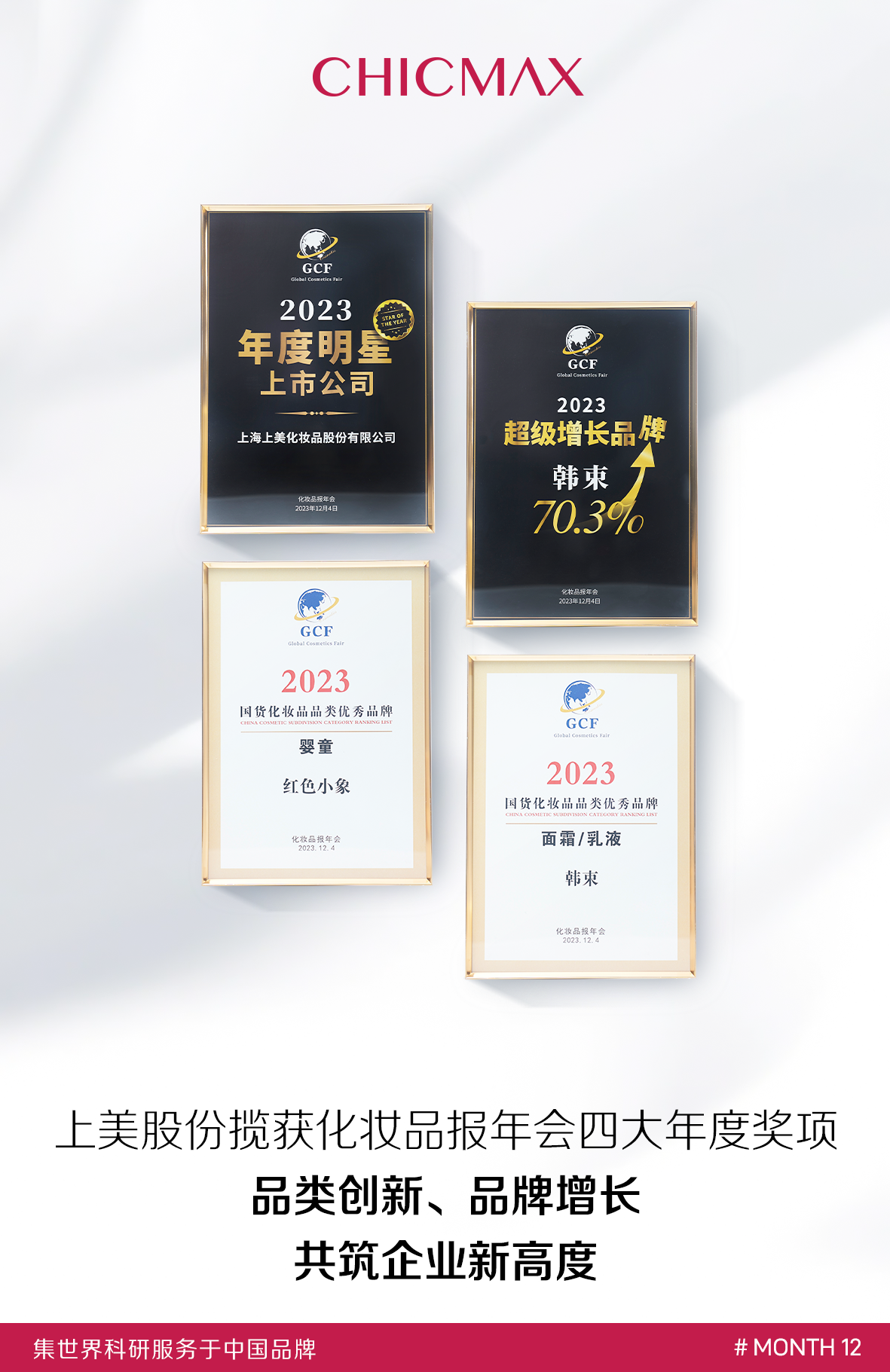 昨日,在行業(yè)盛典2023化妝品報年會中,一系列重磅年度獎項發(fā)布,上美股份狂攬4大年度獎項 ,為即將結(jié)束的2023年榮耀收官——上美榮獲“2023年度明星上市公司”;韓束榮登“2023超級增長品牌名單”和“2023國貨化妝品類優(yōu)秀品牌”面霜/乳液品類榜單;紅色小象榮登“2023國貨化妝品類優(yōu)秀品牌”嬰童品類榜單。