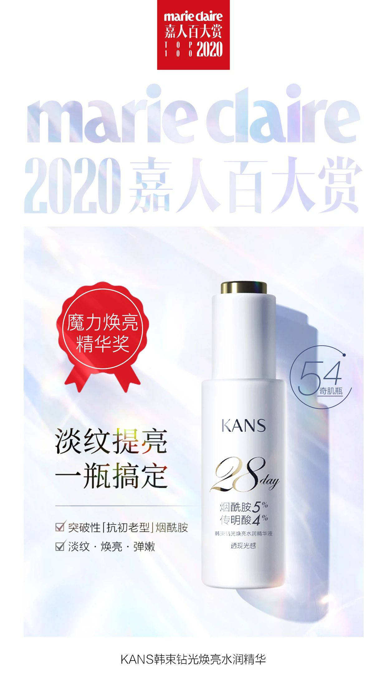 10月15日,2020年嘉人百大賞榜單重磅揭曉。上美集團(tuán)旗下品牌韓束與修麗可、科顏氏等共同登上榜單,韓束新品“54奇肌瓶”斬獲“魔力煥亮”美白精華大獎!