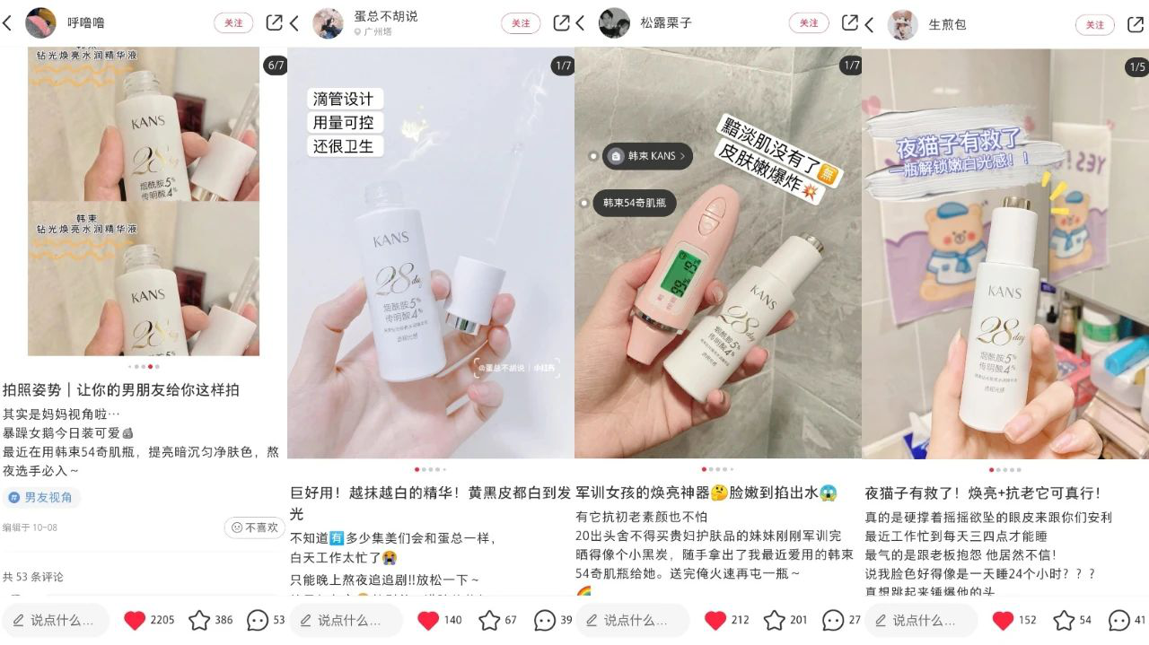 不少用戶種草拔草后,自發(fā)在小紅書等社交平臺分享使用體驗(yàn),充分表示了對上美集團(tuán)韓束54奇肌瓶的喜愛。截至目前,小紅書已產(chǎn)生廣泛的自來水種草,良好口碑持續(xù)發(fā)酵中。許多網(wǎng)友評價,使用后肌膚明顯提亮了,還感受到了細(xì)紋的淡化。