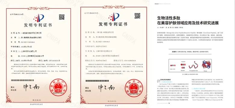 環(huán)六肽-9的獨創(chuàng)性和創(chuàng)新性,正受到行業(yè)和產品端的廣泛認可。目前,該原料已獲2大核心發(fā)明專利授權(包含含金量最高的S級結構專利及功效機理專利),同時,圍繞多肽的功效護膚研究的1篇科技論文已發(fā)表,另有7項工藝、結構、功效等類型的專利正在申請中。