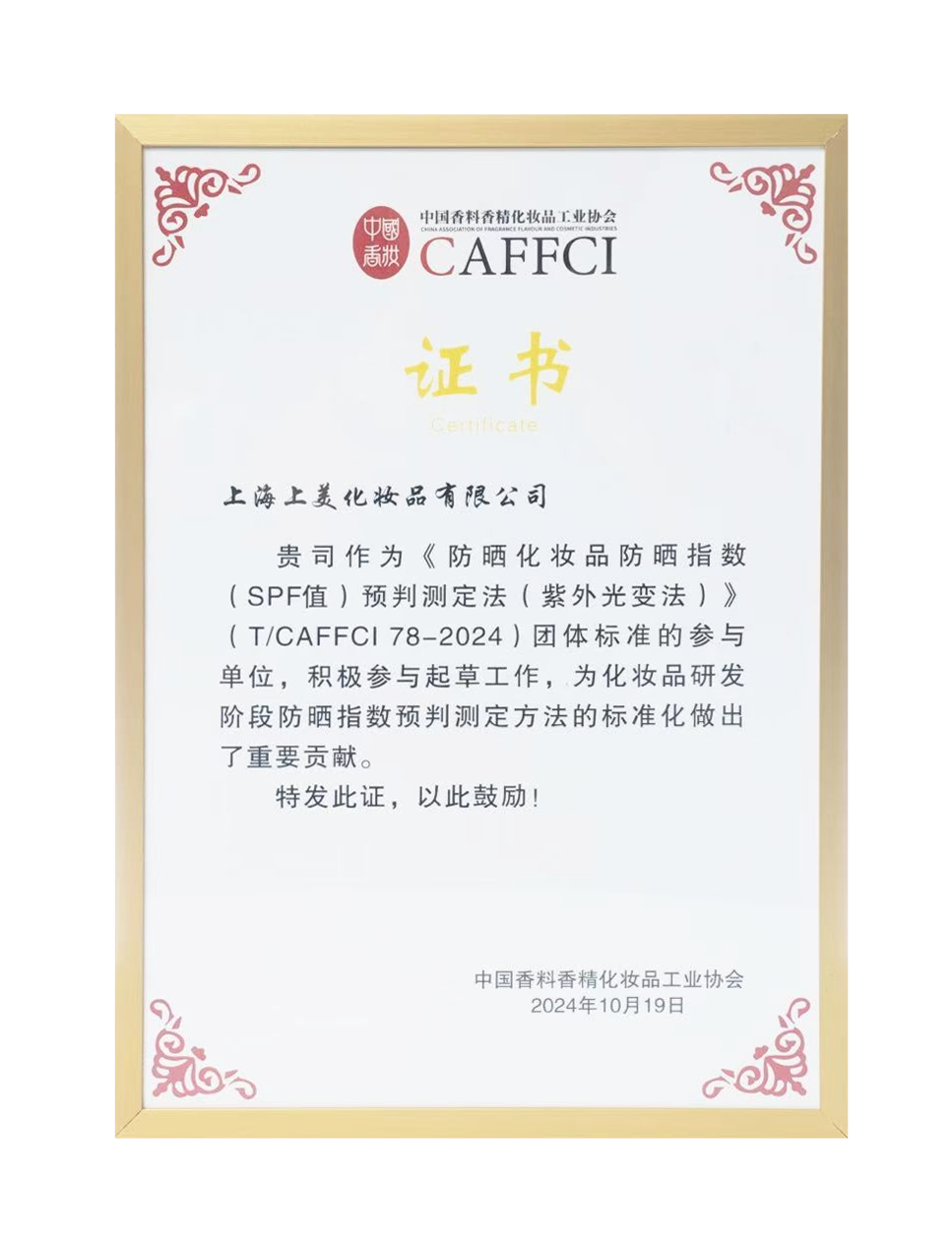 作為領(lǐng)軍企業(yè),上美股份也不斷推動中國化妝品行業(yè)的進(jìn)步,參與多項行業(yè)規(guī)范和標(biāo)準(zhǔn)的制定。例如,今年,上美作為《防曬化妝品防曬指數(shù)(SPF值)預(yù)判測定法(紫外光變法)》(T/CAFFCI78-2024)團(tuán)體標(biāo)準(zhǔn)的參與單位,積極參與起草工作,因此也在本次大會上受到了香化協(xié)會表彰,感謝上美為化妝品研發(fā)發(fā)展做出的重要貢獻(xiàn)。