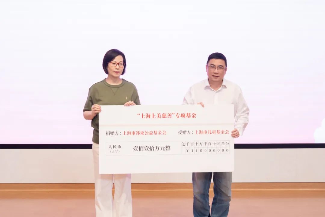 活動現(xiàn)場,上美股份副總裁、韓束基金會理事長俞瑛作為企業(yè)代表,通過韓束基金會向上海市兒童基金會捐贈110萬元,用于“上美慈善專項(xiàng)基金”項(xiàng)目,上海市兒童基金會副理事長陳勇代表市兒基會接受捐贈。