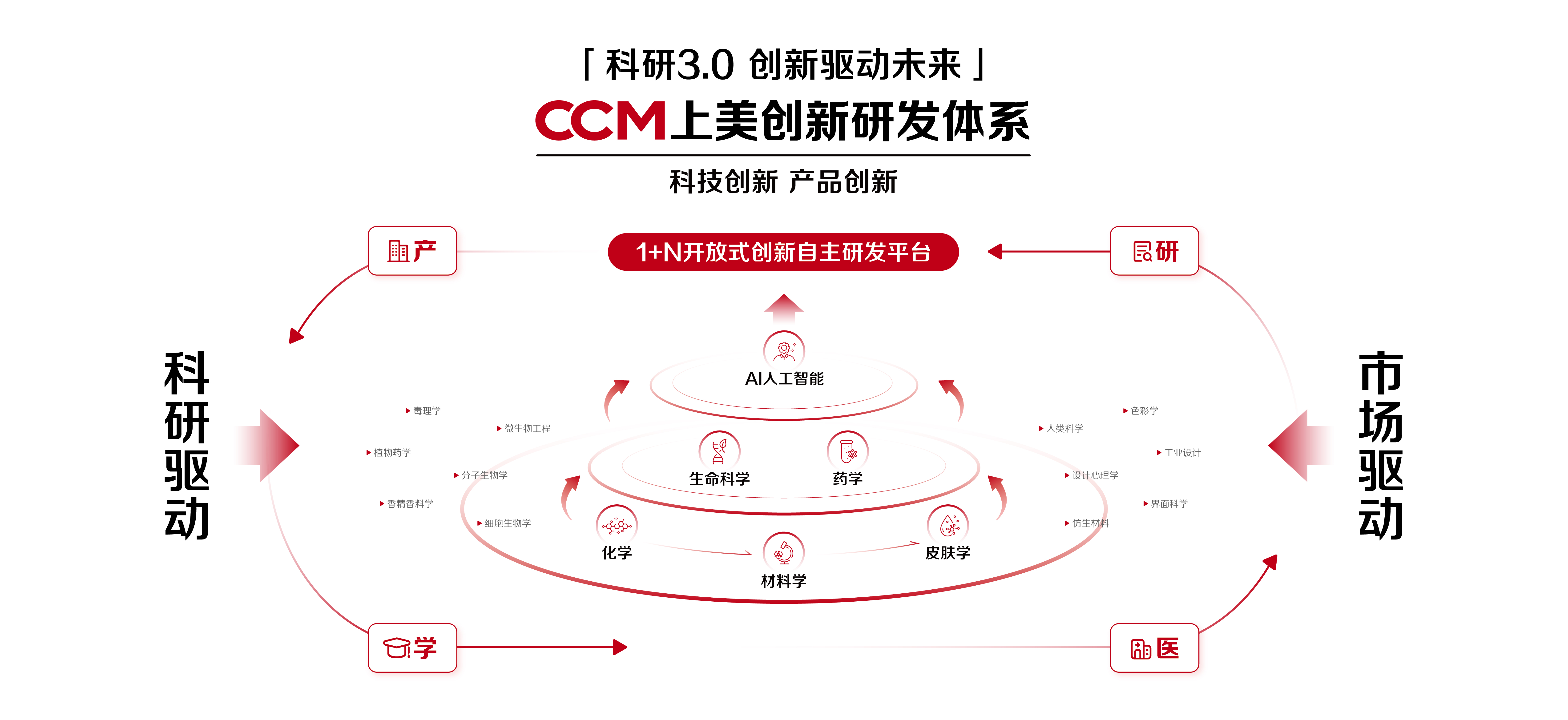 上美自創(chuàng)立之初,便將科研置于戰(zhàn)略高位。經(jīng)過(guò)漫長(zhǎng)的摸索,如今上美已經(jīng)建立起了科研3.0體系,打造了“1+N”產(chǎn)學(xué)研醫(yī)創(chuàng)新平臺(tái),匯聚了全球頂尖科研人才。并且,依托上??偛考昂M饪蒲兄行牡碾p軌布局和高效協(xié)同,持續(xù)深耕基礎(chǔ)研究與前沿技術(shù)轉(zhuǎn)化。