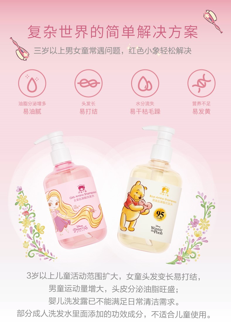 一場(chǎng)“氣質(zhì)相投”的IP合作,一定是基于品牌對(duì)用戶喜好的深刻洞察,這不僅體現(xiàn)在營(yíng)銷層面,在產(chǎn)品開(kāi)發(fā)方面,紅色小象的產(chǎn)品開(kāi)發(fā)也一直秉持著“從C端用戶出發(fā)”的原則,如本次與迪士尼展開(kāi)合作的男童/女童洗發(fā)水。