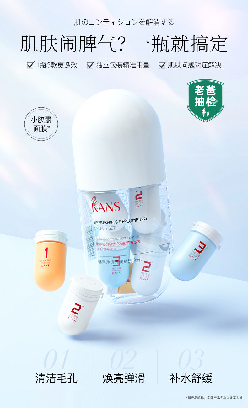 韓束情緒小膠囊面膜具備一瓶多效、精準(zhǔn)護(hù)膚的特點(diǎn),內(nèi)含:溫和調(diào)理角質(zhì)的清潔調(diào)理小膠囊、緊致煥亮的“急救”發(fā)光小膠囊、含有藍(lán)銅勝肽等成分的晚安修護(hù)小膠囊,可隨心搭配解決不同肌膚問題。